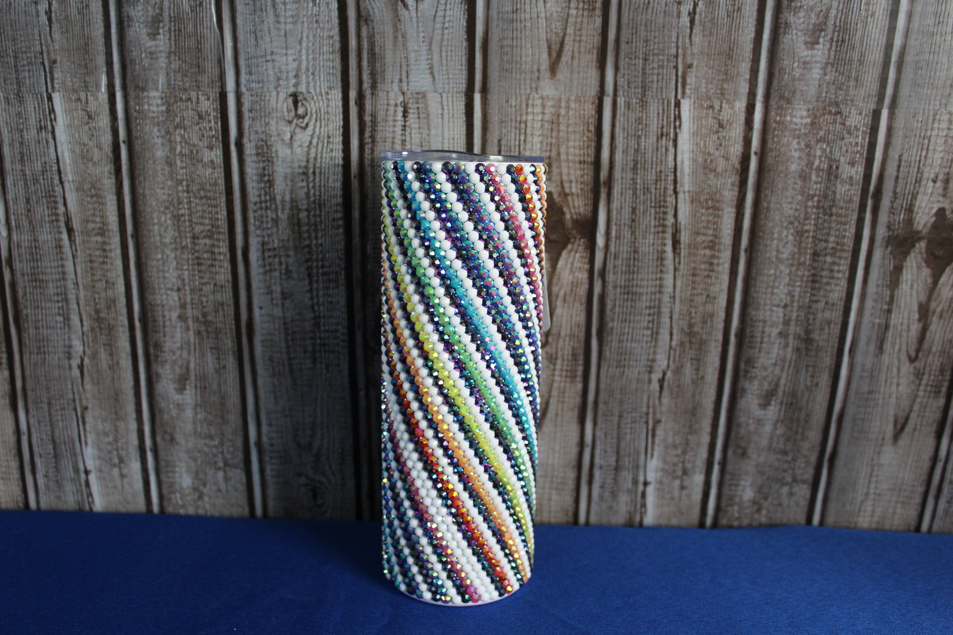 This is a 20 oz. Stainless steel tumbler with rhinestones applied in a honeycomb method.