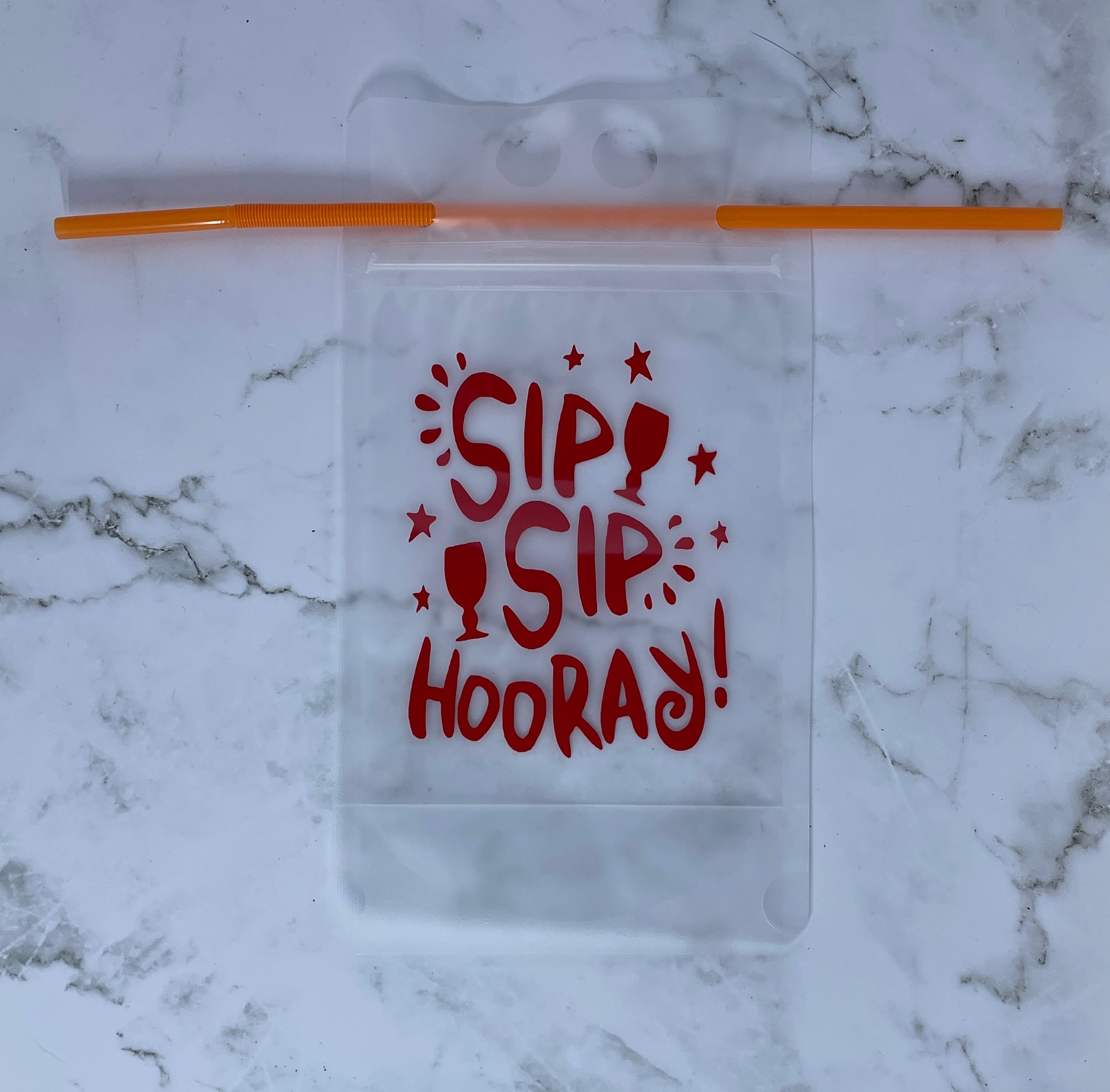 Reusable 16oz Drink Pouches are perfect for pool parties, the lake, the beach, Bachelorette parties, and for so much more! They're 9 inches in height by 5 inches wide. They hold 16 fluid oz. They're completely reusable but should be handwashed to preserve the vinyl. Each pouch comes with a fun bendy straw also! Straw color will vary.